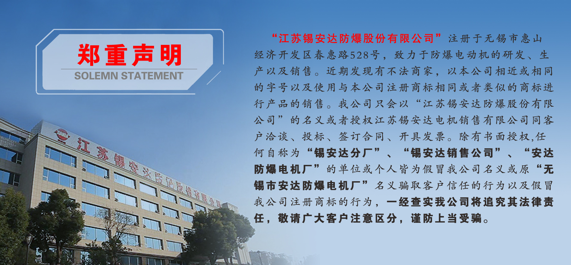 江蘇錫安達(dá)防爆股份有限公司由無(wú)錫市安達(dá)防爆電機(jī)廠和江蘇安達(dá)防爆機(jī)電集團(tuán)有限公司組建而成,從1986年起開(kāi)始生產(chǎn)防爆電機(jī),是首批獲得全國(guó)工業(yè)產(chǎn)品生產(chǎn)許可證的防爆電機(jī)企業(yè)。